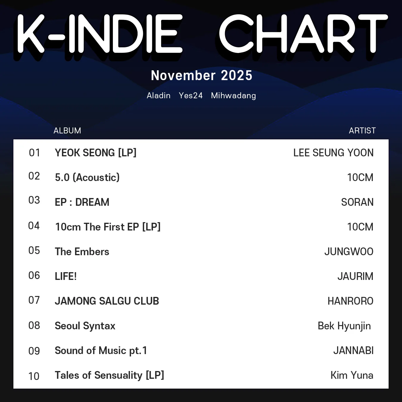 We’re about halfway December, which means we’re looking back at the numbers of November and taking a closer look at the top 10 of the latest K-Indie Chart.